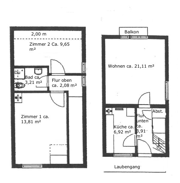 Die Wohnung liegt in einem rotverklinkerten, gepflegten Mehrfamilienhaus und geht über 2 Etagen ( Maisonette ) mit einem kleinen Balkon.